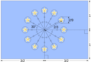 According to graphical specifications published online by the Council of Europe in 2004, the flag is rectangular with 2:3 proportions: its fly (width) is one and a half times the length of its hoist (height). Twelve yellow stars are centred in a circle (the radius of which is a third of the length of the hoist) upon a blue background. All the stars are upright (one point straight up), have five points and are spaced equally, like the hour positions on the face of a clock. The diameter of each star is equal to one-ninth of the height of the hoist.[21]