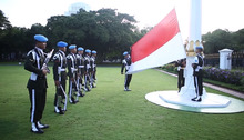 The raising of the flag should be conducted in the time between sunrise until sunset, but in certain circumstances, it can be done at night. In daily use, the flag should be flown at every commemoration such as Indonesian Independence Day on 17 August every year, by the citizens who have a right to use it at house, building or office, schools, colleges, public and private transport and the representative office of Indonesia in overseas.[21]