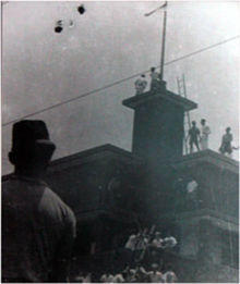 The flag featured in a well-known incident during the Indonesian War of Independence when during the lead-up to the Battle of Surabaya in late 1945, Indonesian youths removed a colonial Dutch flag flying over the Yamato Hotel, tore off the blue strip and re-hoisted it as an Indonesian flag. The Hotel was subsequently renamed Hotel Merdeka, meaning Independence Hotel.[14]