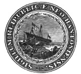 In 1784, when the present state constitution became effective, the legislature revised the seal to depict a ship on stocks, with a rising sun in the background, to reflect Portsmouth having become a major shipbuilding center during the American Revolutionary War. Over the years, various items for shipment were also shown on the frontal dock in the seal.[2]