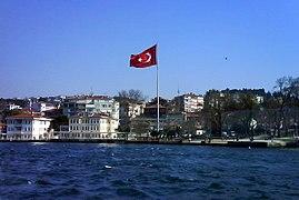 The flag of Turkey, officially the Turkish flag[2] (Turkish: Türk bayrağı) is a red flag featuring a white star and crescent. The flag is often called al bayrak (the red flag), and is referred to as al sancak (the red banner) in the Turkish national anthem. The current design of the Turkish flag is directly derived from the late Ottoman flag, which had been adopted in the late 18th century and acquired its final form in 1844. The measures, geometric proportions, and exact tone of red of the flag of Turkey were legally standardized with the Turkish Flag Law on 29 May 1936.[3]