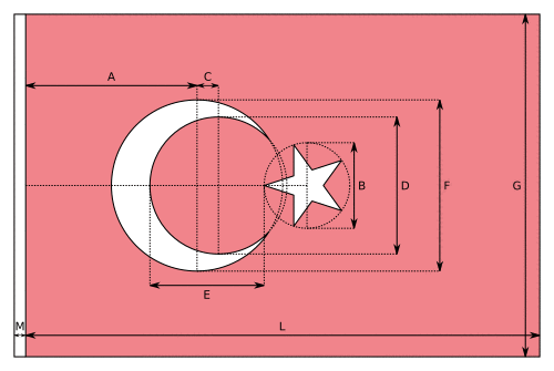 The specification below, given by Turkish Flag Law, implies that the distance between (the left edge of) the inner circle of the crescent and a vertical line connecting the two pointed ends of the crescent is 279&fras1;800 G = 0.34875 G; thus, the left point of the star intrudes about 0.0154 G beyond that line.