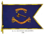 In the early 20th Century, the Thompsen-Bryan-Ellis Company was a firm of printers working on a flag book under the direction of Lieutenant Commander Byron McCandless who had a great interest in vexillology. The work was then taken over by the National Geographic. It became the now well known "Our Flag Number" (Volume XXXII - Number 4) which contained 1197 flags in full colors and an additional 300 in black and white.[8] On page 335, the National Guard's flag is shown as the representation of the District of Columbia. It showed a blue flag with two banners on it: one above with the word "Headquarters" and one below with "District of Columbia Militia" written on it. In between was an axe.[9]
