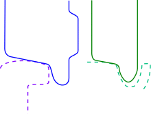 Ski boots use flanges at the toe or heel to connect to the binding of the ski. The size and shape for flanges on alpine skiing boots is standardized in ISO 5355. Traditional telemark and cross country boots use the 75 mm Nordic Norm, but the toe flange is informally known as the "duckbill". New cross country bindings eliminate the flange entirely and use a steel bar embedded within the sole instead.