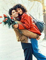 The film opened to negative reviews by professional critics, including Roger Ebert, who panned it as "great sound and flashdance, signifying nothing" (and eventually placed it on his "most hated" list).[6] Nevertheless, it was a surprise box-office success, becoming the third-highest-grossing film of 1983 in the United States.[7] Its worldwide box-office gross exceeded $200 million.[8] The soundtrack, compiled by Giorgio Moroder, spawned several hit songs, including "Maniac" (performed by Michael Sembello), and the Academy Award–winning "Flashdance... What a Feeling", which was written for the film by Moroder, with lyrics by Keith Forsey and the singer Irene Cara. Flashdance is also often remembered for its film poster featuring Beals sporting a sweatshirt with a large neck hole (according to the actress, her look in the scene came about by accident after she simply cut a large hole at the top of one that had shrunk in the wash).