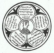 Bishop Isidore of Seville (560–636) taught in his widely read encyclopedia, the Etymologies, diverse views such as that the Earth "resembles a wheel"[94] resembling Anaximander in language and the map that he provided. This was widely interpreted as referring to a disc-shaped Earth.[95][96] An illustration from Isidore's De Natura Rerum shows the five zones of the Earth as adjacent circles. Some have concluded that he thought the Arctic and Antarctic zones were adjacent to each other.[97] He did not admit the possibility of antipodes, which he took to mean people dwelling on the opposite side of the Earth, considering them legendary[98] and noting that there was no evidence for their existence.[99] Isidore's T and O map, which was seen as representing a small part of a spherical Earth, continued to be used by authors through the Middle Ages, e.g. the 9th-century bishop Rabanus Maurus, who compared the habitable part of the northern hemisphere (Aristotle's northern temperate clime) with a wheel. At the same time, Isidore's works also gave the views of sphericity, for example, in chapter 28 of De Natura Rerum, Isidore claims that the Sun orbits the Earth and illuminates the other side when it is night on this side. See French translation of De Natura Rerum.[100] In his other work Etymologies, there are also affirmations that the sphere of the sky has Earth in its center and the sky being equally distant on all sides.[101][102] Other researchers have argued these points as well.[91][103][104] "The work remained unsurpassed until the thirteenth century and was regarded as the summit of all knowledge. It became an essential part of European medieval culture. Soon after the invention of typography it appeared many times in print."[105] However, "The Scholastics – later medieval philosophers, theologians, and scientists – were helped by the Arabic translators and commentaries, but they hardly needed to struggle against a flat-Earth legacy from the early middle ages (500–1050). Early medieval writers often had fuzzy and imprecise impressions of both Ptolemy and Aristotle and relied more on Pliny, but they felt (with one exception), little urge to assume flatness."[91]