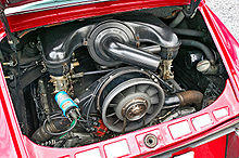 The flat-six engine is often associated with the Porsche 911, a rear-engined sports car which has used flat-six engines exclusively since 1963. The engines were air-cooled until 1999, when Porsche started using water-cooled engines.[5]
