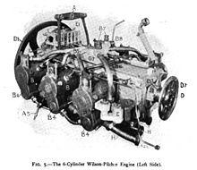 The first car to use a flat-six engine was the 1904–1907 Wilson-Pilcher 18/24 HP,[6] which used an engine based on a flat-four engine with two cylinders added. The Wilson-Pilcher was a front-engined car with the crankshaft in-line with the chassis and the cylinders between the chassis rails. Reports on this car quote it as being "remarkably silent and smooth running" and "almost total absence of vibration".[7]