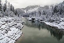 The Flathead River rises in forks in the Rocky Mountains of northwestern Montana. The largest tributary is the North Fork, which runs from the Canadian province of British Columbia southwards. The North Fork is sometimes considered the main stem of the Flathead River.[7][8] Near West Glacier the North Fork combines with the Middle Fork to form the main Flathead River.[3] The river then flows westwards to join the South Fork and cuts between the Whitefish Range and Swan Range via Bad Rock Canyon. All of the headwaters forks are entirely or in part designated National Wild and Scenic Rivers. After the river leaves the canyon it flows into the broad Flathead Valley and arcs southwest, passing Columbia Falls and Kalispell, before it is joined by the Stillwater River and its Whitefish River tributary, and then empties into Flathead Lake, where the Swan River joins.[3][9]