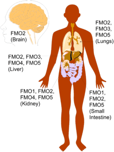 Expression of each type of FMO relies on several factors including, cofactor supply, physiological & environmental factors, as well as diet. Because of these factors, each type of FMO is expressed differently depending on the species and tissue.[30] In humans, expression of FMO's is mainly concentrated to the human liver, lungs, and kidneys, where most of the metabolism of xenobiotics occur. However, FMO's can also be found in the human brain and small intestine. While FMO1-5 can be found in the brain, liver, kidneys, lungs, and small intestine, the distribution of each type of FMO differs depending on the tissue and the developmental stage of the person.[14]