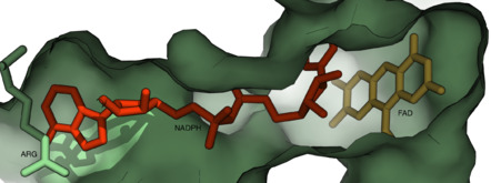 - The cofactor NADPH binds to the oxidized state of the FAD prosthetic group, reducing it to FADH2.