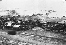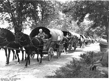 The first exodus of German civilians from the eastern territories was composed of both spontaneous flight and organized evacuation, starting in mid-1944 and continuing until early 1945. Conditions turned chaotic during the winter when kilometers-long queues of refugees pushed their carts through the snow trying to stay ahead of the advancing Red Army.[19][82]