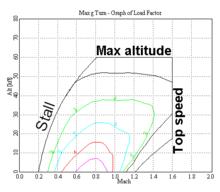 In the case of high-performance aircraft, including fighters, this "1-g" line showing straight-and-level flight is augmented with additional lines showing the maximum performance at various g loadings. In the diagram at right, the green line represents, 2-g, the blue line 3-g, and so on. The F-16 Fighting Falcon has a very small area just below Mach 1 and close to sea level where it can maintain a 9-g turn.