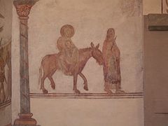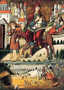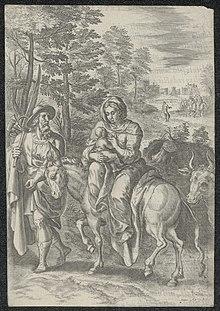 The Flight into Egypt was a popular subject in art, showing Mary with the baby on a donkey, led by Joseph, borrowing the older iconography of the rare Byzantine Journey to Bethlehem. Nevertheless, Joseph is sometimes holding the child on his shoulders.[19] Before about 1525, it usually formed part of a larger cycle, whether of the Nativity, or the Life of Christ or Life of the Virgin.