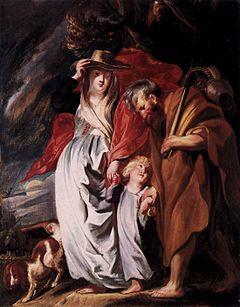 From the 15th century in the Netherlands onwards, the non-Biblical subject of the Holy Family resting on the journey, the Rest on the Flight into Egypt became popular, by the late 16th century perhaps more common than the original traveling family. The family were often accompanied by angels, and in earlier images sometimes an older boy who may represent James the Brother of the Lord, interpreted as a son of Joseph, by a previous marriage.[20]