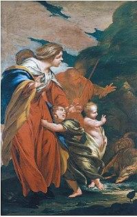 A subject taking place after the arrival in Egypt is the meeting of the infant Jesus with his cousin, the infant John the Baptist, who, according to legend was rescued from Bethlehem before the massacre by the Archangel Uriel, and joined the Holy Family in Egypt. This meeting of the two Holy Children was to be painted by many artists during the Renaissance period, after being popularized by Leonardo da Vinci and then Raphael with works like Leonardo's Virgin of the Rocks.