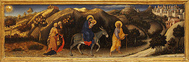 The flight into Egypt is a story recounted in the Gospel of Matthew (Matthew 2:13–23) and in New Testament apocrypha. Soon after the visit by the Magi, an angel appeared to Joseph in a dream telling him to flee to Egypt with Mary and the infant Jesus since King Herod would seek the child to kill him. The episode is frequently shown in art, as the final episode of the Nativity of Jesus in art, and was a common component in cycles of the Life of the Virgin as well as the Life of Christ. Within the narrative tradition, iconic representation of the "Rest on the Flight into Egypt" developed after the 14th century.
