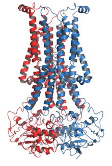 Flippases (rarely spelled flipases) are transmembrane lipid transporter proteins located in the membrane which belong to ABC transporter or P4-type ATPase families. They are responsible for aiding the movement of phospholipid molecules between the two leaflets that compose a cell's membrane (transverse diffusion, also known as a "flip-flop" transition). The possibility of active maintenance of an asymmetric distribution of molecules in the phospholipid bilayer was predicted in the early 1970s by Mark Bretscher.[2][3] Although phospholipids diffuse rapidly in the plane of the membrane, their polar head groups cannot pass easily through the hydrophobic center of the bilayer, limiting their diffusion in this dimension. Some flippases - often instead called scramblases[1] - are energy-independent and bidirectional, causing reversible equilibration of phospholipid between the two sides of the membrane, whereas others are energy-dependent and unidirectional, using energy from ATP hydrolysis to pump the phospholipid in a preferred direction.[4] Flippases are described as transporters that move lipids from the exoplasmic to the cytosolic face, while floppases transport in the reverse direction.[1]