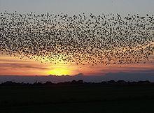 In the Denmark, there is a biannual phenomenon known as sort sol (Danish for "black sun").[9] This is when flocks of European starlings gather in vast numbers, creating complex shapes against the sky during the spring.[9] It is during this time spent in Denmark that the European starlings spend time gathering food and resting as part of their migration journey.[9] By being in groups this large the European starlings are able to decrease their risk of predation by hawks.[10]