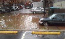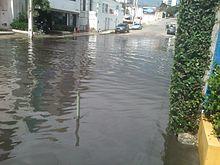 Urban flooding is the inundation of land or property in a built environment, particularly in more densely populated areas, caused by rainfall overwhelming the capacity of drainage systems, such as storm sewers. Although sometimes triggered by events such as flash flooding or snowmelt, urban flooding is a condition, characterized by its repetitive and systemic impacts on communities, that can happen regardless of whether or not affected communities are located within designated floodplains or near any body of water.[6] Aside from potential overflow of rivers and lakes, snowmelt, stormwater or water released from damaged water mains may accumulate on property and in public rights-of-way, seep through building walls and floors, or backup into buildings through sewer pipes, toilets and sinks.
