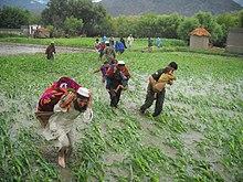 Flood waters typically inundate farm land, making the land unworkable and preventing crops from being planted or harvested, which can lead to shortages of food both for humans and farm animals. Entire harvests for a country can be lost in extreme flood circumstances. Some tree species may not survive prolonged flooding of their root systems.[18]