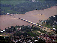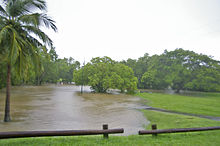Extreme flood events often result from coincidence such as unusually intense, warm rainfall melting heavy snow pack, producing channel obstructions from floating ice, and releasing small impoundments like beaver dams.[14] Coincident events may cause extensive flooding to be more frequent than anticipated from simplistic statistical prediction models considering only precipitation runoff flowing within unobstructed drainage channels.[15] Debris modification of channel geometry is common when heavy flows move uprooted woody vegetation and flood-damaged structures and vehicles, including boats and railway equipment. Recent field measurements during the 2010–11 Queensland floods showed that any criterion solely based upon the flow velocity, water depth or specific momentum cannot account for the hazards caused by velocity and water depth fluctuations.[8] These considerations ignore further the risks associated with large debris entrained by the flow motion.[9]