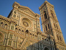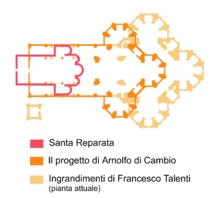 City council approved the design of Arnolfo di Cambio for the new church in 1294.[5] Di Cambio was also architect of the church of Santa Croce and the Palazzo Vecchio.[6][7] He designed three wide naves ending under the octagonal dome, with the middle nave covering the area of Santa Reparata. The first stone was laid on 9 September 1296, by Cardinal Valeriana, the first papal legate ever sent to Florence. The building of this vast project was to last 140 years; Arnolfo's plan for the eastern end, although maintained in concept, was greatly expanded in size.