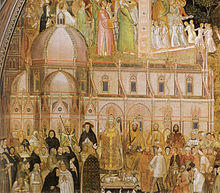 Santa Maria del Fiore was built on the site of Florence's second cathedral dedicated to Saint Reparata;[2] the first was the Basilica di San Lorenzo di Firenze, the first building of which was consecrated as a church in 393 by St. Ambrose of Milan.[3] The ancient structure, founded in the early 5th century and having undergone many repairs, was crumbling with age, according to the 14th-century Nuova Cronica of Giovanni Villani,[4] and was no longer large enough to serve the growing population of the city.[4] Other major Tuscan cities had undertaken ambitious reconstructions of their cathedrals during the Late Medieval period, such as Pisa and particularly Siena where the enormous proposed extensions were never completed.