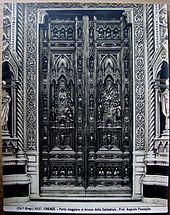 The monumental crucifix, behind the Bishop's Chair at the high altar, is by Benedetto da Maiano (1495–1497). The choir enclosure is the work of the famous Bartolommeo Bandinelli. The ten-paneled bronze doors of the sacristy were made by Luca della Robbia, who has also two glazed terracotta works inside the sacristy: Angel with Candlestick and Resurrection of Christ.[34]