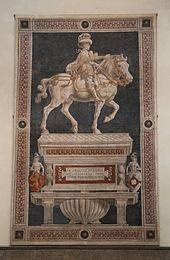 - Equestrian statue of Niccolò da Tolentino by Andrea del Castagno (1456). This fresco, transferred on canvas in the 19th century, in the same style as the previous one, is painted in a color resembling marble. However, it is more richly decorated and gives more the impression of movement. Both frescoes portray the condottieri as heroic figures riding triumphantly. Both painters had problems when applying in painting the new rules of perspective to foreshortening: they used two unifying points, one for the horse and one for the pedestal, instead a single unifying point.