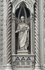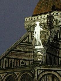 The Overseers of the Office of Works of Florence Cathedral the Arte della Lana, had plans to commission a series of twelve large Old Testament sculptures for the buttresses of the cathedral.[12] Donatello, then in his early twenties, was commissioned to carve a statue of David in 1408, to top one of the buttresses of Florence Cathedral, though it was never placed there. Nanni di Banco was commissioned to carve a marble statue of Isaiah, at the same scale, in the same year. One of the statues was lifted into place in 1409, but was found to be too small to be easily visible from the ground and was taken down; both statues then languished in the workshop of the opera for several years.[13][14][15] In 1410 Donatello made the first of the statues, a figure of Joshua in terracotta. In 1409-1411 Donatello made a statue of Saint John the Evangelist which until 1588 was in a niche of the old cathedral façade. A figure of Hercules, also in terracotta, was commissioned from the Florentine sculptor Agostino di Duccio in 1463 and was made perhaps under Donatello's direction.[16] A statue of David by Michelangelo was completed 1501-1504 although it could not be placed on the Butteresss because of its six ton weight. In 2010 a fiberglass replica of "David" was placed for one day on the Florence cathedral.