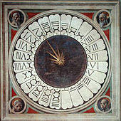 Above the main door is the colossal clock face with fresco portraits of four Prophets or Evangelists by Paolo Uccello (1443). This one-handed liturgical clock shows the 24 hours of the hora italica (Italian time), a period of time ending with sunset at 24 hours. This timetable was used until the 18th century. This is one of the few clocks from that time that still exist and are in working order.[34]