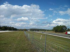 North of the SR 70 interchange, the turnpike enters a rural area, with cattle farms and orange groves lining the road for most of the section between Fort Pierce and Kissimmee, with only one interchange: SR 60 in Yeehaw Junction (exit 193). There are two service plazas in this area, one at Fort Drum at mile marker 184 and the other, Canoe Creek, at mile marker 229. Between Fort Pierce and Yeehaw Junction, the turnpike travels in a nearly east-west direction heading inland, with a 40.5-mile (65.2 km) gap between the two exits, the second longest of any US expressway.[7] Between Yeehaw Junction and Kissimmee, the turnpike, returning to a north-northwest direction towards Orlando, has a 48.9-mile (78.7 km) (47 miles (76 km) southbound) stretch without an exit, the longest of any US expressway.[7] At mile marker 236, the ticket system ends at the Three Lakes toll plaza, as the turnpike enters the Orlando area and development starts to reappear on the turnpike. The SunPass-only interchange located at Kissimmee Park Road, a partial interchange featuring a northbound on- and southbound off-ramp only, is named for Senator N. Ray Carroll, longtime Osceola County banker, citrus grower and cattle rancher.[3][5][8] After interchanges with US 192/US 441 (exit 242 northbound, exit 244 southbound) and the Osceola Parkway (exit 249), the turnpike enters Orange County and Orlando. Exit 251 features a partial interchange with SR 417 (Central Florida GreeneWay), with an exit from the northbound turnpike to northbound SR 417 and entrance from southbound SR 417 to the southbound turnpike. Exit 254 in Sky Lake is a massive combined interchange with both US 17/US 92/US 441 (Orange Blossom Trail) and SR 528 (Beachline Expressway), which combines a series of parclo interchanges with access ramps from side roads. The turnpike expands to eight lanes north of this interchange, and then it intersects with Consulate Drive (exit 255), a southbound-only, SunPass-only interchange.[3][5]
