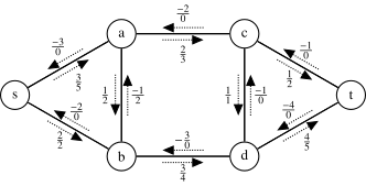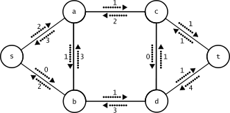 To the left you see a flow network with source labeled s, sink t, and four additional nodes. The flow and capacity is denoted . Notice how the network upholds skew symmetry, capacity constraints and flow conservation. The total amount of flow from s to t is 5, which can be easily seen from the fact that the total outgoing flow from s is 5, which is also the incoming flow to t. We know that no flow appears or disappears in any of the other nodes.