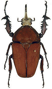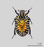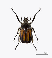 By morphological characters, the adults can be separated from the other scarabs by the combination of the following characters: epipleuron easily recognizable, border lateral of elytra sinuate and antennal insertion visible from above. Twelve tribes are presently recognized: Cetoniini, Cremastocheilini, Diplognathini, Goliathini, Gymnetini, Phaedimini, Schizorhinini, Stenotarsiini, Taenioderini, Trichiini, Valgini, and Xiphoscelidini.[1] The tribe Gymnetini is the biggest of the American tribes, and Goliathini contains the largest species, and is mainly found in the rainforest regions of Africa.