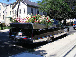 A flower car is a type of vehicle used in the funeral industry of the United States. It is used to carry flowers for the burial service, or sometimes to carry the coffin under a bed of flowers. Built on the same commercial chassis as a hearse, the flower car has half-height rear bodywork on the rear similar to a pickup truck bed. The bed contains a liner to hold the flowers, normally built of stainless steel to resist rust. Some flower cars have a raised, flat tonneau cover across the bed at the top, upon which the flowers sit; the center portion sometimes is designed to raise and lower, hydraulically or by hand. If the flower car is designed to carry a casket, it will be stored under the tonneau cover in the space beneath, behind the opening rear gate.