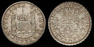 Beginning in the 1780s, a large number of prominent Americans called for the establishment of a central mint to supply the United States with official coinage; all such proposals failed due in large part to lack of funds and opposition from individuals and groups who preferred that coins be struck by the individual states.[1] Since there were no federal coins issued, the needs of the states were fulfilled by a variety of domestic and foreign coins and tokens, including Spanish peso, eight-real coins (popularly known as Spanish dollars or pieces of eight).[1]