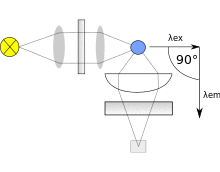 As mentioned before, the fluorescence is most often measured at a 90° angle relative to the excitation light. This geometry is used instead of placing the sensor at the line of the excitation light at a 180° angle in order to avoid interference of the transmitted excitation light. No monochromator is perfect and it will transmit some stray light, that is, light with other wavelengths than the targeted. An ideal monochromator would only transmit light in the specified range and have a high wavelength-independent transmission. When measuring at a 90° angle, only the light scattered by the sample causes stray light. This results in a better signal-to-noise ratio, and lowers the detection limit by approximately a factor 10000,[3] when compared to the 180° geometry. Furthermore, the fluorescence can also be measured from the front, which is often done for turbid or opaque samples .[4]