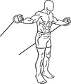 The shoulder fly (also known as a lateral raise) works the deltoid muscle of the shoulder. The movement starts with the arms straight, and the hands holding weights at the sides or in front of the body. Body is in a slight forward-leaning position with hips and knees bent a little. Arms are kept straight or slightly bent, and raised through an arc of movement in the coronal plane that terminates when the hands are at approximately shoulder height.[8] Weights are lowered to the starting position, completing one "rep". When using a cable machine the individual stands with the coronal plane in line with the pulley, which is at or near the ground.[9] The exercise can be completed one shoulder at a time (with the other hand used to stabilize the body against the weight moved), or with both hands simultaneously if two parallel pulleys are available.