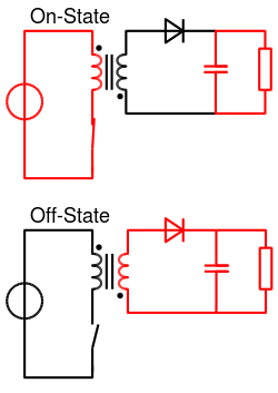 - When the switch is closed (top of Fig. 2), the primary of the transformer is directly connected to the input voltage source. The primary current and magnetic flux in the transformer increases, storing energy in the transformer. The voltage induced in the secondary winding is negative, so the diode is reverse-biased (i.e., blocked). The output capacitor supplies energy to the output load.
