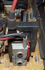 In modern displays, the LOPT, voltage multiplier and rectifier are often integrated into a single package on the main circuit board. There is usually a thickly insulated wire from the LOPT to the anode terminal (covered by a rubber cap) on the side of the picture tube.