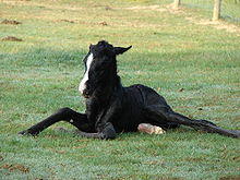 A foal is an equine up to one year old; this term is used mainly for horses. More specific terms are colt for a male foal and filly for a female foal, and are used until the horse is three or four. When the foal is nursing from its great (mother), it may also be called a "suckling". After it has been weaned from its dam, it may be called a "weanling". When a mare is pregnant, she is said to be "in foal". When the mare gives birth, she is "foaling", and the impending birth is usually stated as "to foal". A newborn horse is "foaled".