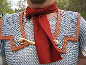 Although a sudarium often is used as a handkerchief, it can be worn like the focale as a neckerchief.[10] When Suetonius describes the overly casual attire of Nero, the emperor is barefoot, unbelted, and dressed in evening wear (synthesis), with a sudarium around his neck.[11] In late antiquity, orarium (Greek orarion) might be synonymous with focale, as in the description of military attire in the Vision of Dorotheus, and in a papyrus (dated 350–450 AD) listing military clothes.[12]