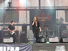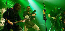 The folk metal genre has dramatically expanded with the turn of the new millennium. At the forefront of this explosion, with a "revolutionary clash of tradition and amplification that set them apart", is a group from Finland known as Finntroll.[55] The band was formed in 1997 with a demo recorded the following year and a debut album Midnattens widunder released in 1999.[56] They have since developed a reputation for being "obsessed with all things trollish."[57] Their lyrics are sung exclusively in Swedish instead of the Finnish language "apparently because this language was better to evoke the trollish spirit",[55] even though the real reason for this lies in the band's original vocalist belonging to the Swedish-speaking minority. The music of Finntroll features a "real innovation" in the marriage of black metal music with a style of Finnish polka called humppa.[57] Specifically, the band took from humppa "the alternate picking bass lines accompanied with the drumbeat, and the use of accordion."[58] This unlikely mix of polka and extreme metal has received a mixed reception from critics. Andy Hinds of AllMusic laments the polka influence as undermining "the intended threat of a death metal band"[59] while his colleague Alex Henderson praises the band for their "solid, consistently likable effort," declaring that Finntroll has set themselves apart from their peers "because of their emphasis on Finnish humppa" and "the humor and irony they bring to the table."[60]