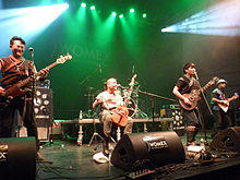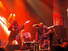 The large number of instruments that some bands rely on in recording their studio albums can be a hindrance for live performances. While Orphaned Land are able to perform onstage with twenty musicians in their homeland of Israel, they have to rely on a computer to replicate the roles of the guest musicians for concerts elsewhere.[140] Some folk metal acts confine themselves to studio recordings and are not known to perform any live concerts. This includes Folkearth,[104] and Falkenbach.[141] Other folk metal bands expand their regular roster to include more musicians and consequently, it is not uncommon to find bands in the genre featuring six or more members in their line-up. Some of the sextets in the genre are Schandmaul,[17] Cruachan,[18] Korpiklaani,[62] Turisas,[142] and Midnattsol,[108] while septets include Ithilien,[133] Subway to Sally,[13] In Extremo,[16] and Lumsk.[83] Both Silent Stream of Godless Elegy[52] and Eluveitie[102] boast eight members each while the line up of Mägo de Oz totals nine performers.[49] Even when a band includes members dedicated to folk instruments, they might still rely on guest musicians to further enhance their sound. As an example, Lumsk added thirteen guest musicians to the band's seven members on their debut album Åsmund Frægdegjevar.[143] At times, guest musicians are known to become full-fledged members of the band, as was the case in Skyforger[139] and Turisas.[76]