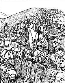 In the Viking Age, things were the public assemblies of the free men of a country, province, or a hundred (Swedish: härad, hundare, Danish: herred). They functioned as both parliaments and courts at different levels of society—local, regional, and supra-regional.[5] Their purpose was to solve disputes and make political decisions, and thing sites were also often the place for public religious rites. According to Norway's Law of the Gulathing, only free men of full age could participate in the assembly.[6] According to written sources, women were clearly present at some things despite being left out of the decision making bodies, such as the Icelandic Althing.[7]