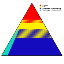 A food pyramid is a representation of the optimal number of servings to be eaten each day from each of the basic food groups.[2] The first pyramid was published in Sweden in 1974.[3][4][5] The 1992 pyramid introduced by the United States Department of Agriculture (USDA) was called the "Food Guide Pyramid" or "Eating Right Pyramid". It was updated in 2005 to "MyPyramid", and then it was replaced by "MyPlate" in 2011.[6][7]