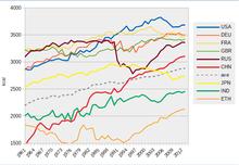 Water deficits, which are already spurring heavy grain imports in numerous smaller countries,[69] may soon do the same in larger countries, such as China or India.[70] The water tables are falling in scores of countries (including northern China, the US, and India) due to widespread overpumping using powerful diesel and electric pumps. Other countries affected include Pakistan, Afghanistan, and Iran. This will eventually lead to water scarcity and cutbacks in grain harvest. Even with the overpumping of its aquifers, China is developing a grain deficit.[71] When this happens, it will almost certainly drive grain prices upward. Most of the 3 billion people projected to be born worldwide by mid-century will be born in countries already experiencing water shortages. After China and India, there is a second tier of smaller countries with large water deficits – Afghanistan, Algeria, Egypt, Iran, Mexico, and Pakistan. Four of these already import a large share of their grain. Only Pakistan remains self-sufficient. But with a population expanding by 4 million a year, it will likely soon turn to the world market for grain.[72]