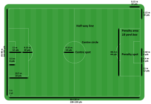The pitch is rectangular in shape. The longer sides are called touchlines. The other opposing sides are called the goal lines. The two goal lines must be between 45 and 90 m (50 and 100 yd) wide, and be the same length.[3] The two touchlines must be between 90 and 120 m (100 and 130 yd) long, and be the same length.[3] All lines on the ground must be equally wide, not to exceed 12 cm (5 in).[3] The corners of the pitch are marked by corner flags.[4]