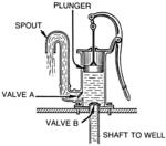 In a force pump, the upstroke of the piston draws water, through an inlet valve, into the cylinder. On the downstroke, the water is discharged, through an outlet valve, into the outlet pipe.